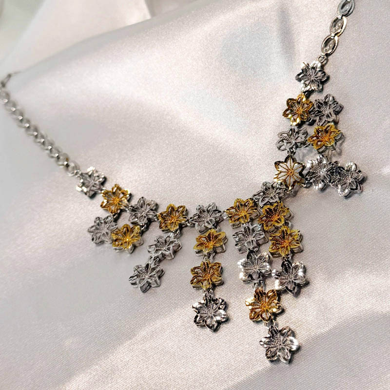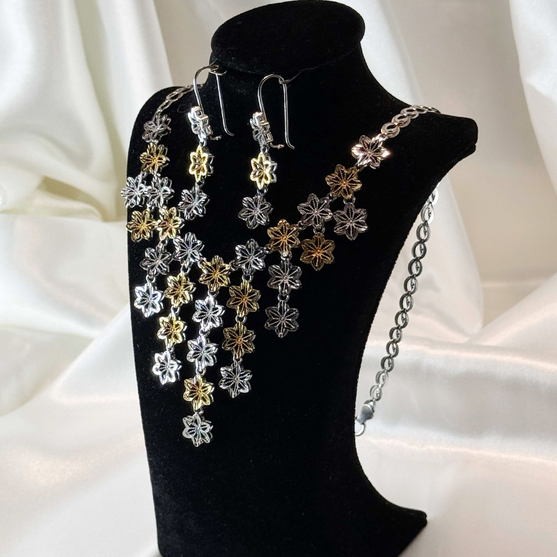 نیمست فلاور طلا ۱۸ عیار با وزن کل 28/06 گرم شامل گوشواره و آویز گردنبند است و طراحی زیبای گل مانند آن جلوهای لوکس و شیک به استایل شما میبخشد. این نیمست مناسب استفاده در مجالس، مهمانیها و حتی هدیه دادن به عزیزان است.