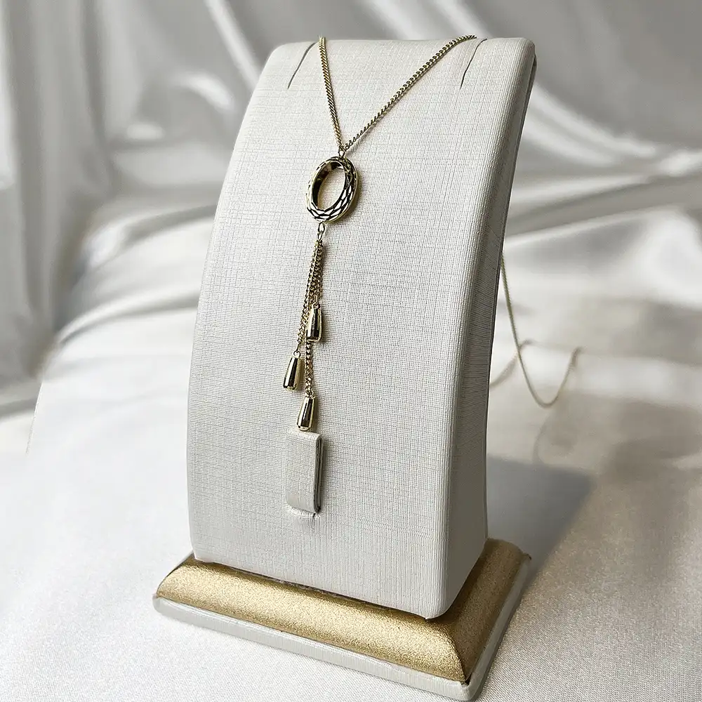 این گردنبند طلا با طراحی خاص حلقهای و آویزدار، ترکیبی هنرمندانه از ظرافت و حرکت را به نمایش میگذارد. آویزهای ظریف و کشیده در کنار فرم دایرهای پلاک، جلوهای متفاوت و مدرن ایجاد کرده که آن را از مدلهای ساده متمایز میکند؛ انتخابی ایدهآل برای علاقهمندان به طلای مینیمال اما چشمگیر.